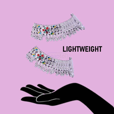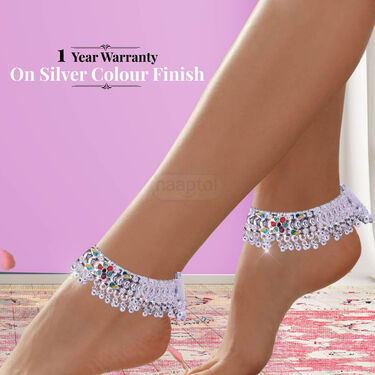 Adorn your feet with this exquisite designer payal featuring intricate meenakari work and a silver-color finish. Lightweight and free size, it blends elegance and comfort for every occasion.